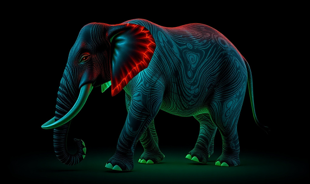 <entity:elephant, texture:bioluminescent(pattern=swirl, color=[#4B0082], intensity=pulsing), color_base:#DDA0DD, light:diffuse, render:organic+photorealistic, style:symbolic_comfort>